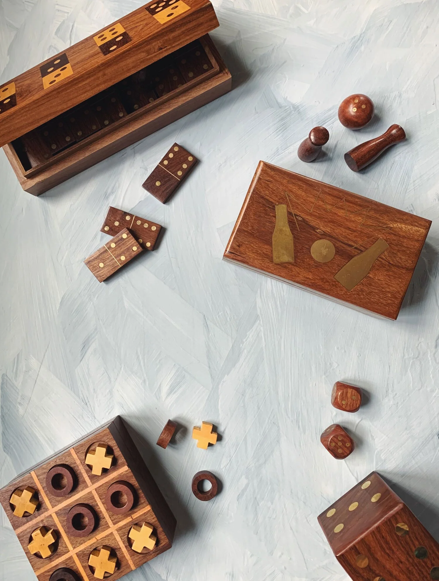 A sleek and unique mini-bowling game carved from responsibly harvested Indian Rosewood, this set is elegant and unique. Intricate brass details decorate the case, which contains 10 pins and 2 balls.